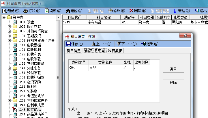在“庫存商品”,“主營業(yè)務收入”,“主營業(yè)務成本”三個科目掛接輔助核算項目“商品”。并把這3個科目,選上數(shù)量核算。如下圖: