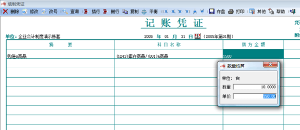 在日常填制憑證時,當輸入“庫存商品”,“主營業(yè)務收入”科目的金額后,會自動跳出數(shù)量、單價窗口。如下圖: