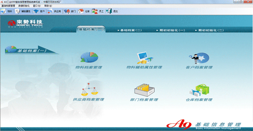 基礎(chǔ)信息管理系統(tǒng)是各項(xiàng)基本檔案管理、初始化數(shù)據(jù)管理的中心,檔案信息包括物料檔案、商品檔案、客戶檔案、供應(yīng)商檔案、倉庫檔案、經(jīng)辦人檔案等十一項(xiàng)檔案信息,初始化數(shù)據(jù)管理包括期初庫存初始化、期初應(yīng)付賬款初始化、期初應(yīng)收賬款初始化等八項(xiàng)初始化信息。