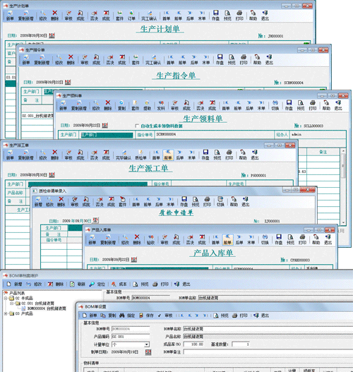生產(chǎn)制造管理系統(tǒng)為企業(yè)管理生產(chǎn)物流提供可靠的數(shù)據(jù)信息。本系統(tǒng)主要包括生產(chǎn)計(jì)劃管理、生產(chǎn)指令管理、生產(chǎn)領(lǐng)料管理、生產(chǎn)派工管理、生產(chǎn)質(zhì)檢管理、產(chǎn)品入庫管理、委外加工管理、統(tǒng)計(jì)報(bào)表及基礎(chǔ)信息管理等模塊。系統(tǒng)可以進(jìn)行生產(chǎn)計(jì)劃及物料需求計(jì)劃編排工作,對產(chǎn)品的生產(chǎn)成本進(jìn)行預(yù)算管理。通過產(chǎn)品BOM單管理,理清各項(xiàng)產(chǎn)品的構(gòu)成物料及數(shù)量。車間生產(chǎn)管理以“生產(chǎn)指令單”為主軸,實(shí)時監(jiān)控每一個指令單的執(zhí)行情況。