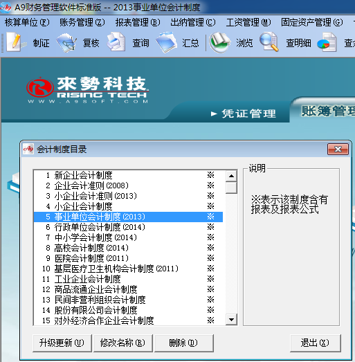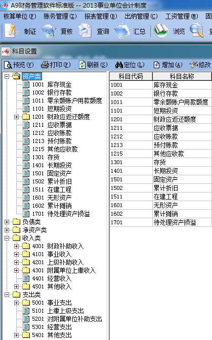 為方便廣大用戶能及時(shí)用上最新的事業(yè)單位會(huì)計(jì)制度,A9財(cái)務(wù)管理軟件于2012年底,將該制度的科目,報(bào)表設(shè)計(jì)進(jìn)軟件中,如圖: